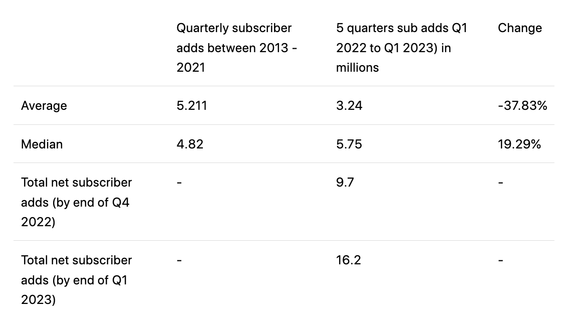 For the base case, the total net subscriber adds would be 16.2m by Q1 2023,which would give Netflix three quarters to re-adjust the strategy and get back to growth mode.